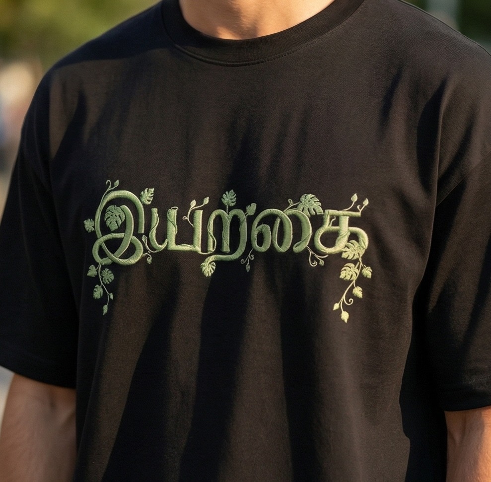 The Iyarkai (Nature) Graphic Tee is more than just a piece of clothing; it’s a statement of connection. Designed for the modern minimalist who values heritage, this shirt features the Tamil word for “Nature” in a unique, inspired font that looks as though it’s growing right off the fabric