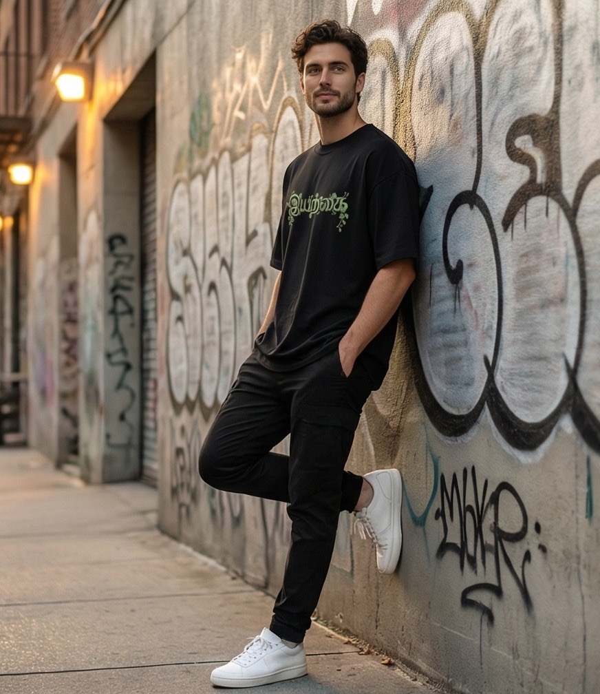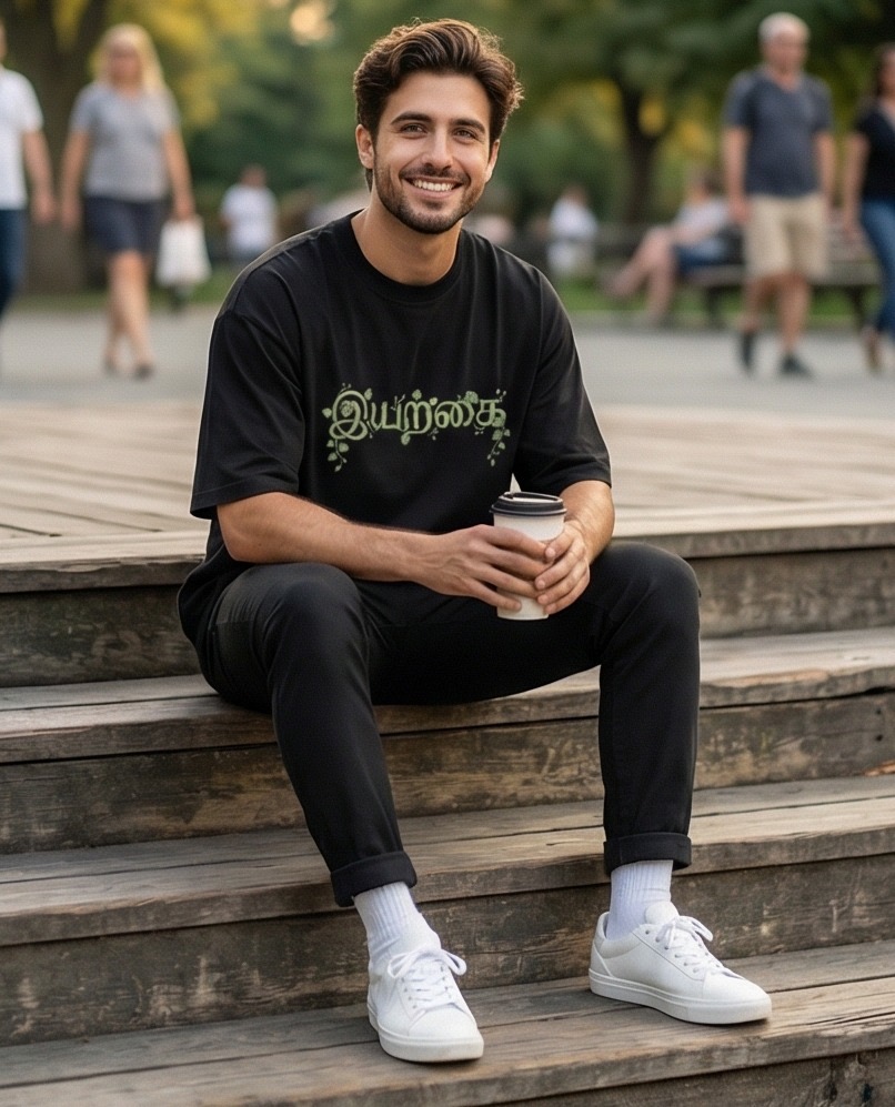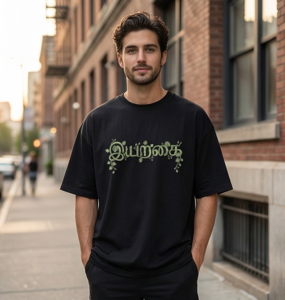 Embrace your roots with the Iyarkai Oversized Tee. Featuring Tamil typography, this premium black t-shirt combines cultural pride with effortless urban style. Perfect for those who find their peace in the wild