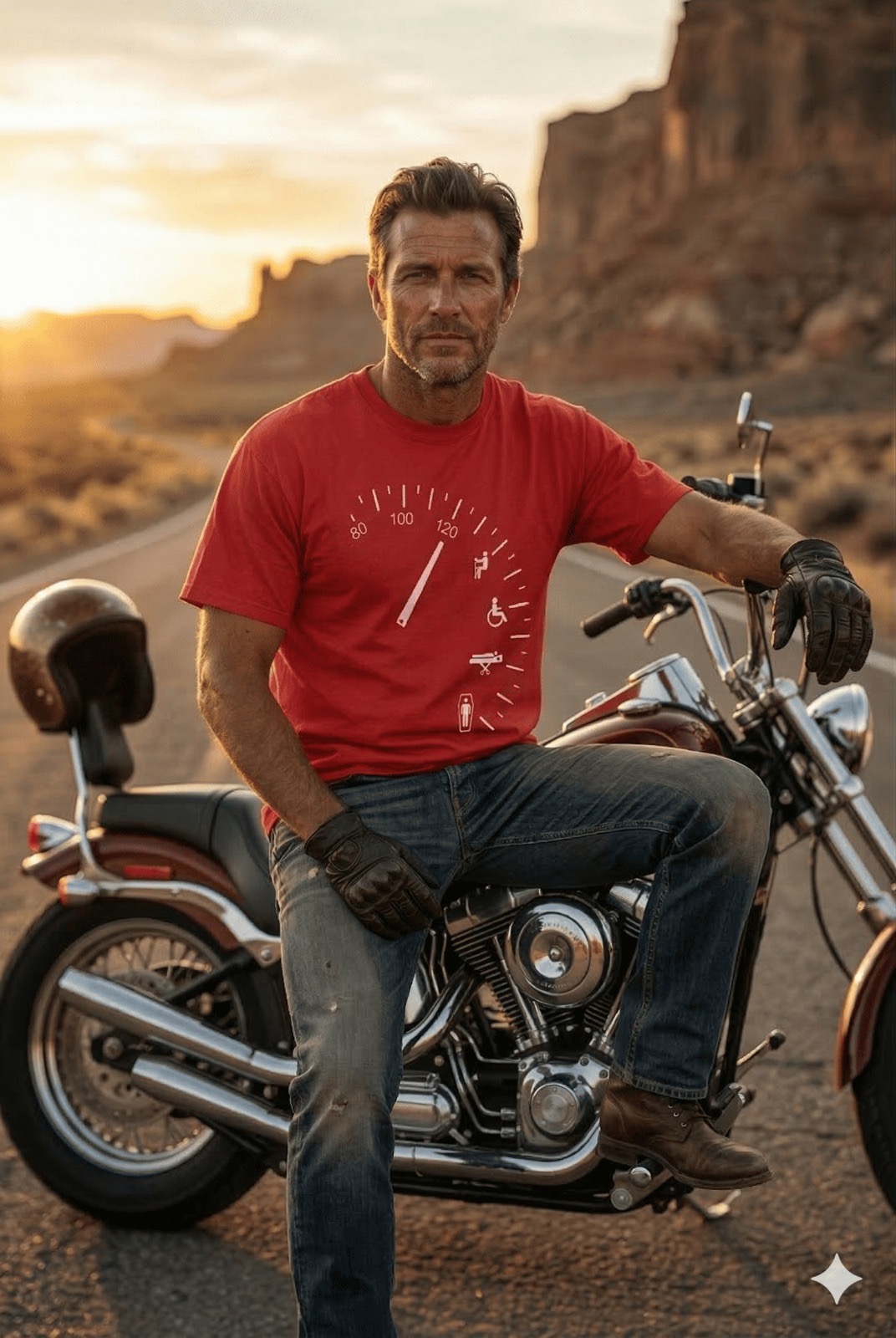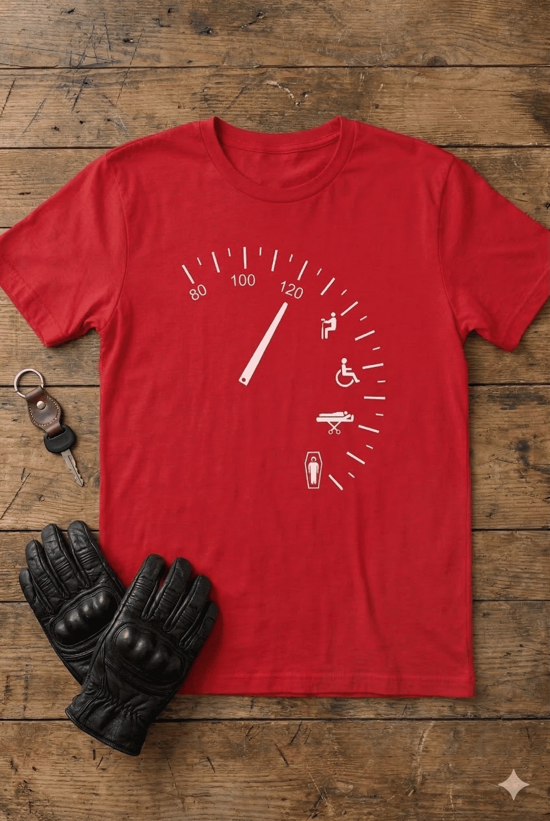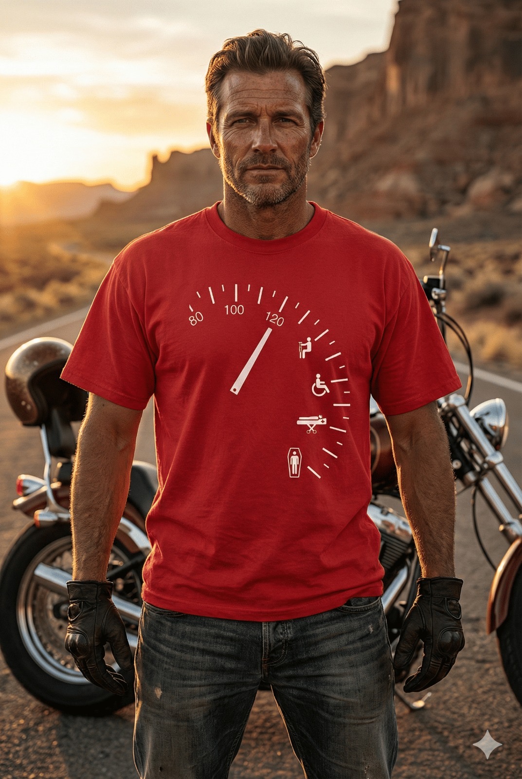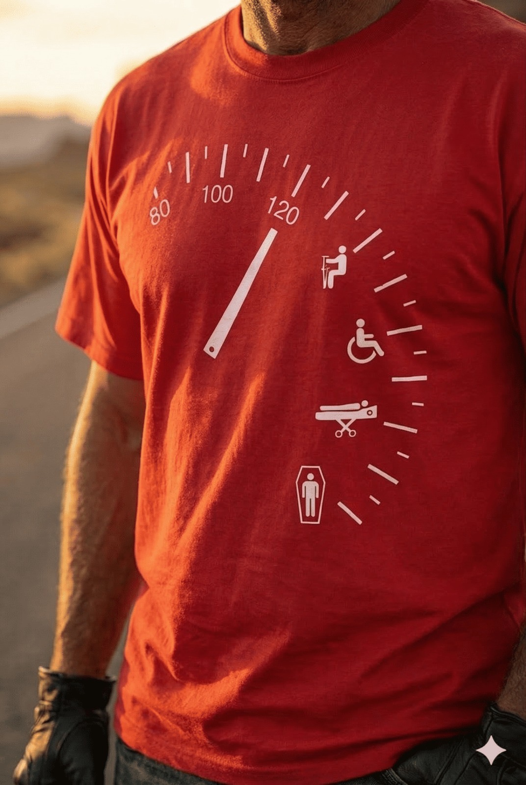 Pushing the limits comes with a price, and this shirt says it all without uttering a single word. Designed for the rider who understands the thin line between adrenaline and the aftermath, this tee features a striking speedometer graphic that transitions from high speed to the sobering reality of the road.