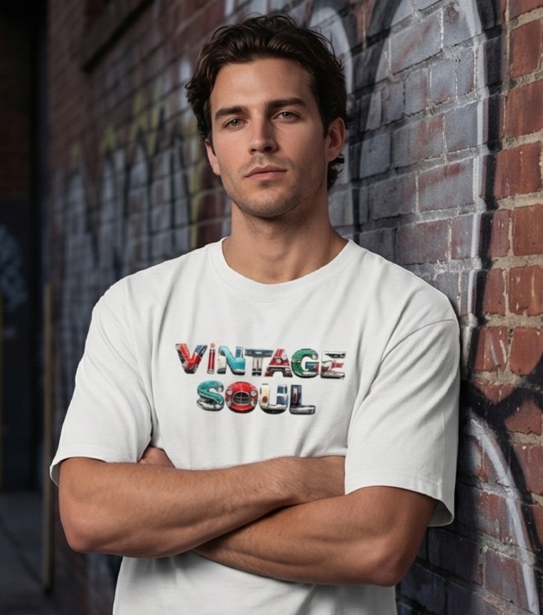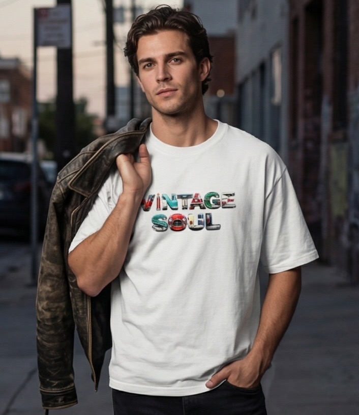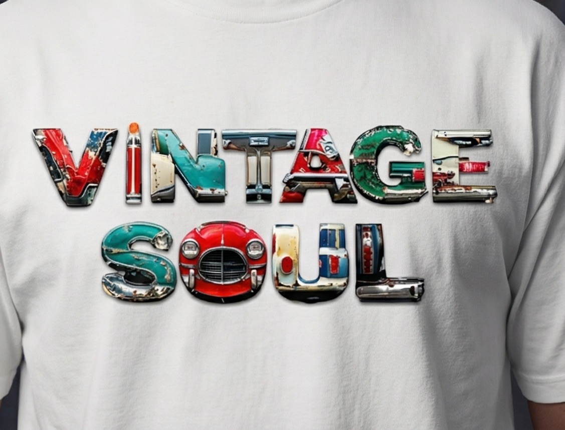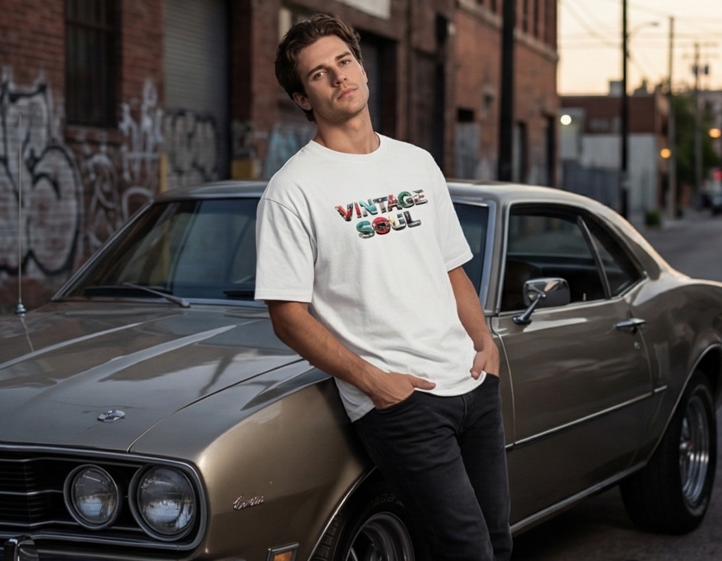 This isn’t your average flat-print graphic; the “Vintage Soul” lettering is rendered with a 3D metallic effect, mimicking the heavy-duty emblems found on the hoods of mid-century muscle cars. It’s a bold, tactile look that turns a simple white tee into a piece of wearable art.